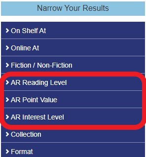 You can search our library catalog by AR reading level, AR point value, or AR interest level. This will help you find both physical books and eBooks in the Metro Library's collection, at the right reading level for young readers.